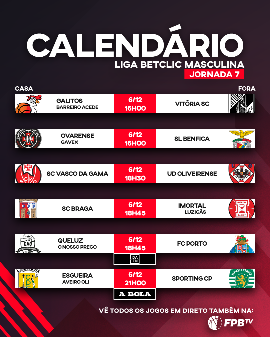 Às 18h45 iniciam-se dois jogos em simultâneo: o SC Braga recebe o Imortal LUZiGÁS, enquanto o Queluz | O NOSSO PREGO enfrenta o FC Porto. O encontro terá transmissão na DAZN.