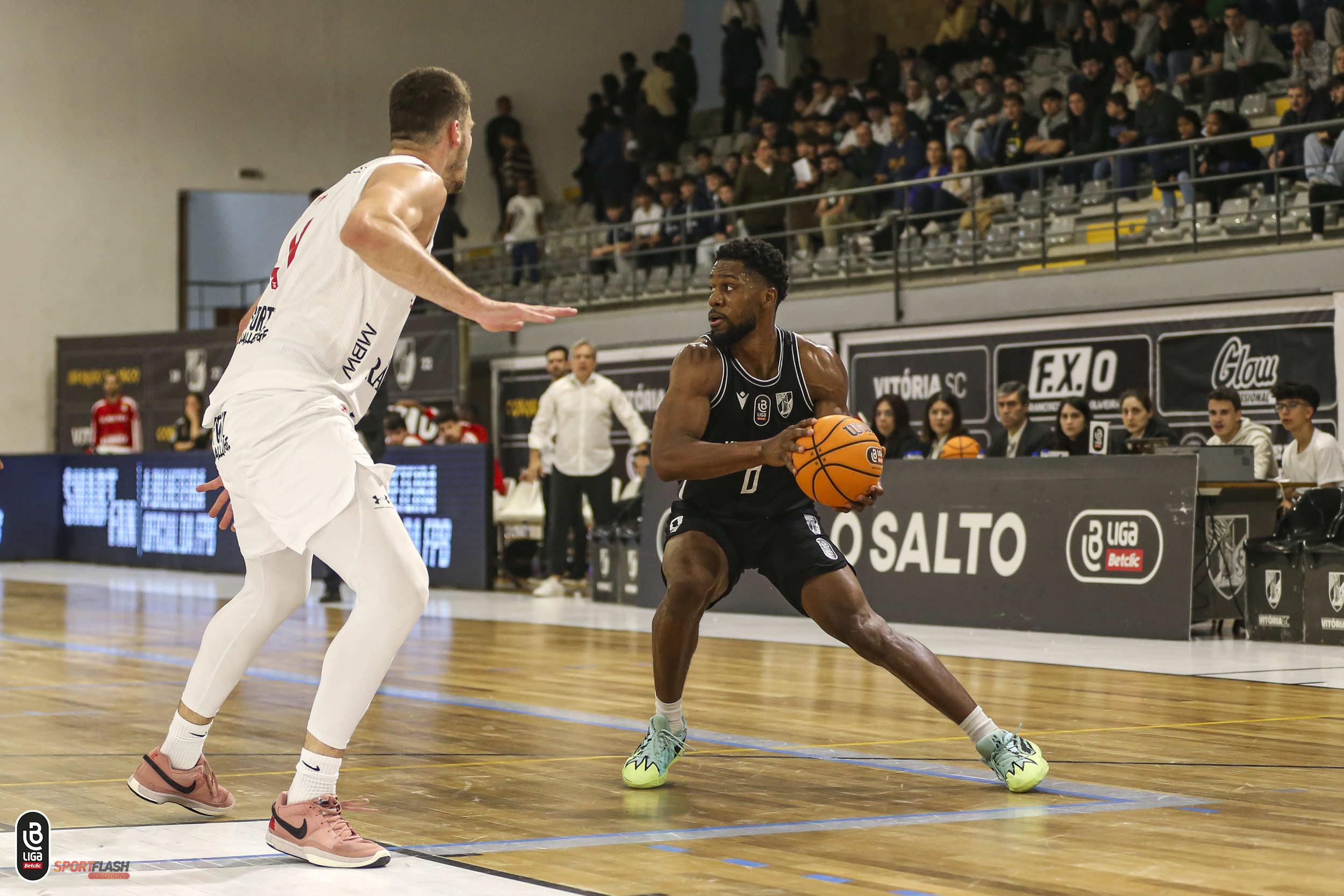 Estava 77-71 no marcador aos quatro minutos do último quarto, mas os alvinegros aguentaram-se e devolveram um parcial de 15-6 para fechar as contas do Jogo 2. Gustavo Teixeira, MVP do encontro, combinou 23 pontos com seis ressaltos, cinco assistências e ainda dois desarmes de lançamento (24.5val), numa exibição muito consistente do base de Ovar.