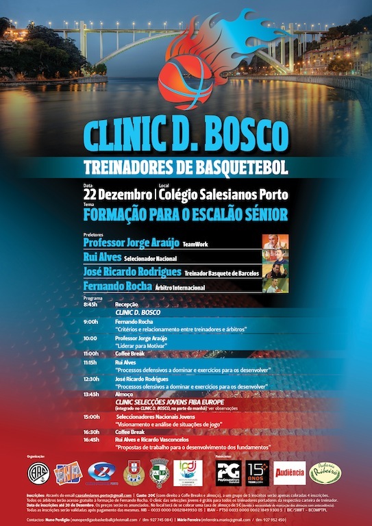 Na 1ª intervenção do dia, Fernando Rocha, um dos juízes mais prestigiados em Portugal e árbitro Euroleague Basketball, referir-se-á à sempre polémica Relação Treinador/Àrbitro. De seguida, toma a palavra uma das incontornáveis referências da modalidade – Prof. Jorge Araújo – que abordará os aspectos da Liderança e Motivação inerentes à função de Treinador. Na 3ª prelecção da manhã, Rui Alves, experiente Selecionador Nacional que tem desenvolvido a sua actividade nas Selecções Nacionais jovens e treinador FIBA Europe dirigir-se-á aos treinadores presentes referindo-se às questões defensivas na formação. O ataque ficará a cargo do técnico José Ricardo Rodrigues, Treinador do BC Barcelos, equipa da LPB, treinador que se tem destacado pela aposta constante que faz em jovens atletas. E isto tudo antes de almoço. Da parte da tarde, numa parceria com a Escola Nacional de Treinadores, a Federação Portuguesa de Basquetebol e a Associação de Basquetebol do Porto, apresentaremos o Clinic Seleções Jovens FIBAEUROPE, onde serão visualizadas imagens video de Campeonatos Europeus e discutidas formas de trabalho adequadas ao desenvolvimento do basquetebol a nível Europeu. Após esta saudável discussão, serão sugeridos métodos de trabalho para a formação por dois dos mais prestigiados seleccionadores nacionais da actualidade Rui Alves e Ricardo Vasconcelos. Local: COLÉGIO SALESIANOS PORTO Data: 22 DEZEMBRO INSCRIÇÃO: 20€ (inclui almoço e coffee breaks ; grupos de 5 o valor passará a 80€; árbitros com acesso gratuito à prelecção de Fernando Rocha; confirmação até dia 21´após essa data será cobrado extra de 5€ por pessoa pelo almoço)