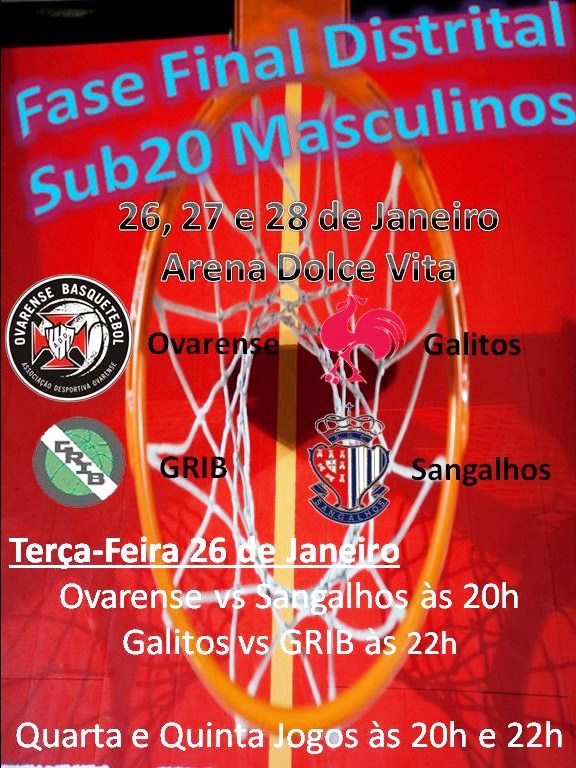 Realiza-se nos próximos dias 26, 27 e 28 de Janeiro, a Fase Final distrital de Aveiro no escalão de Sub20 Masculinos. A Fase Final terá lugar em Ovar, na Arena Dolce Vita, e terá como equipas participantes, a Ovarense, o Galitos, GRIB e Sangalhos.O primeiro dia de competição será marcado pelos seguintes jogo:Ovarense vs Sangalhos às 20hGalitos vs GRIB às 22hNos dias seguintes os jogos serão sempre às 20h e as 22h.