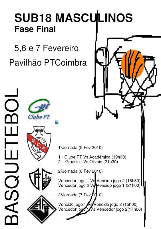 Decorre no próximo fim-de-semana a Fase Final do Campeonato Distrital de Sub-18 Masculinos da Associação de Basquetebol de Coimbra. Em competição estão as equipas classificadas nas primeiras quatro posições na fase regular: Clube Portugal Telecom, Ginásio Clube Figueirense, Olivais Futebol Clube e Associação Académica de Coimbra.Os jogos decorrem no Pavilhão da Portugal Telecom, com o seguinte horário:Sexta-Feira, dia 5 de Fevereiro de 201019h30 – Telecom Vs Académica21h30 – Ginásio Vs OlivaisSábado, dia 6 de Fevereiro de 201018h30 – Vencedor do 1º Jogo Vs Vencido do 2º Jogo21h00 – Vencedor do 2º Jogo Vs Vencido do 1º Jogo Domingo, dia 7 de Fevereiro de 201015h00 – Vencido do 1º Jogo Vs Vencido do 2º Jogo17h00 – Vencedor do 1º Jogo Vs Vencedor do 2º JogoContamos com todos os amantes da modalidade e familiares, valorizando este ponto alto com a sua presença.