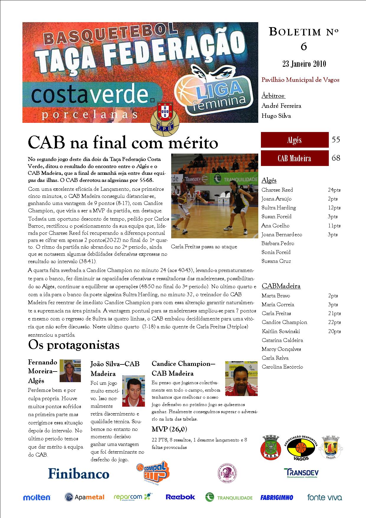 Boa Viagem Angra Açores e CAB Madeira jogarão amanhã uma final insular e ficarão para a história do basquetebol nacional feminino como as primeiras equipas finalistas da nova Taça Federação da Liga Feminina. As açoreanas conseguiram superiorizar-se ao Vagos na primeira meia-final (78-64) com mais um brilhante desempenho das estrangeiras – Shannon Howell que voltou a ultrapassar a barreira dos 30 pontos e Chevon Kate com um duplo-duplo (18 pts e 14 res). Na segunda meia-final, o CAB Madeira ultrapassou um dificil Algés que só claudicou nos últimos 10 minutos (55-68), depois do equilibrio ter marcado toda a partida.