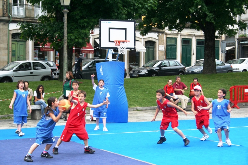 A secção de basquetebol do S.C. BRAGA levou a efeito neste fim-de-semana, 13 e 14 de Junho, o seu 1º Torneio Internacional de Minibasquete. O torneio reuniu equipas de minibasquete da Ovarense, E.D. Viana, B.C.Pombal e C.B.Airexa (de Nigrán, Galiza), bem como várias equipas do S.C. Braga, e decorreu na Praça do Município. Neste local foram instalados dois campos de minibasquete e um insuflável e ali decorreram os jogos de basquetebol bem como muitas das outras actividades previstas: hip hop, caça ao tesouro e jogos do ambiente, tendo ainda havido oportunidade para todos os jovens participantes de se deslocarem às piscinas municipais. Foram dois dias de muita animação e convívio entre os pequenos praticantes de basquetebol bracarenses e os amigos que os visitaram. Foi uma verdadeira festa do minibasquete que todos mereciam e que é o culminar de uma época plena de actividade e em que os objectivos traçados por esta jovem secção do clube bracarense foram integralmente alcançados. Lembramos que era primeiro objectivo da presente época para a secção de basquetebol fomentar a prática do minibasquete no clube, com o propósito de assim garantir no futuro muitos dos praticantes que hão-de fazer parte das equipas dos demais escalões de formação. E pelo que se viu na Praça do Município o futuro está garantido. Muita dedicação ao basquetebol e um prazer enorme na sua prática foram uma constante de todos quanto estiveram presentes. E foram muitos os que se quiseram associar a esta iniciativa que despertou a curiosidade de muitos bracarenses que por ali passaram. Os apoios também foram indispensáveis para o sucesso do evento. Sem o apoio dos patrocinadores, bem como da Câmara Municipal de Braga, da Braval e do Centro Social e Cultural de Stº Adrião não teria sido possível levar a efeito um evento desta natureza e envergadura. Estes são, sem dúvida, amigos do minibasquete do S.C. Braga. Em reconhecimento e incentivo pelo trabalho já feito, foi com natural satisfação que os responsáveis do basquetebol bracarense tiveram a oportunidade de exibir o trabalho já feito ao Director Técnico nacional, San Payo Araújo, que fez questão de estar presente ao longo de todo o evento e que nele participou da forma sempre motivadora que imprime às suas intervenções. Foi, aliás, com a sua participação que foram entregues os troféus, medalhas e recordações às equipas, treinadores e atletas participantes no Torneio. Foi um momento particularmente feliz porquanto foi perceptível o quanto tinha agradado a todos o fim-de-semana que ali acabava. Pela certa será o primeiro de muitos torneios que o S.C. Braga organizará dando corpo a todo o trabalho que desenvolve ao longo do ano com várias dezenas de atletas de minibasquete. O cada vez maior reconhecimento do minibasquete bracarense é uma realidade que apenas encontra como obstáculo a dificuldade de espaços para treino dos pequenos atletas. Com uma casa própria que possibilitasse treinos às muitas dezenas de atletas que demandam o clube, seria bem mais fácil dar continuidade a este crescimento e implementação do basquetebol. Apesar desta grande dificuldade, o S.C. Braga recebeu o certificado de qualidade de Escola Portuguesa de Minibasquete, atribuído pela Federação Portuguesa de Basquetebol, e orgulha-se de ser presentemente a maior escola distrital de minibasquete. Com várias equipas do clube em actividade nas competições distritais, e já com três núcleos em estabelecimentos de ensino de Braga (Colégio de Nª Senhora das Graças, Colégio Paulo VI e Colégio Teresiano), é também com muita dedicação que uma equipa feminina de minibasquete participa no Circuito Ticha Penicheiro. A par destas actividades têm sido muitas as participações de equipas de minibasquete do S.C. Braga em muitos torneios para os quais têm sido convidadas. Um pouco por todo o país o nome do S.C. Braga e do seu basquetebol têm sido divulgados por pequenos embaixadores que muito se orgulham de vestir as cores do seu clube.