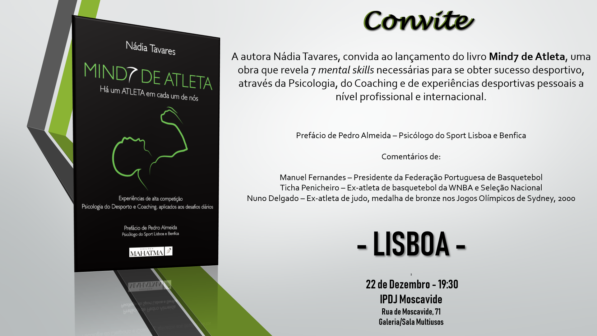 Este sábado, a partir das 19h30, na sede do IPDJ, em Moscavide (Lisboa), vai decorrer a apresentação do livro "Mind7 de Atleta", da autoria de Nádia Tavares.