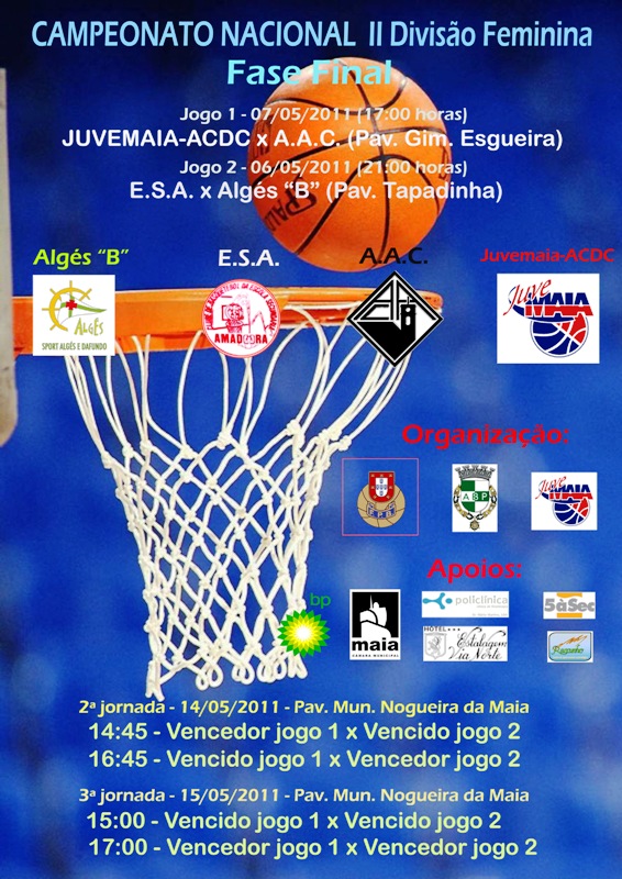 Tal como está previsto no regulamento a 1ª jornada decorrerá em camposconsiderados neutros:ES Amadora x Algés “B”Pav. Tapadinha – 06.05.2011 – 21H00Juvemaia ACD X AA CoimbraPav. Gimn. Esgueira – 07.05.2011 – 17H00De acordo com os resultados registados nesta 1ª jornada, as equipas serãoemparelhadas para a 2ª e 3ª jornadas, da seguinte forma:Pav. Mun. Nogueira da Maia14.05.201114H45 – Vencedor 1 x Vencido 2;16H45 – Vencido 1 x Vencedor 2;15.05.201115H00 – Vencido 1 x Vencido 2;17H00 – Vencedor 1 x Vencedor 2;Os dois primeiros classificados da Fase Final disputarão, na época seguinte,o Campeonato Nacional de Seniores Femininos da I Divisão.