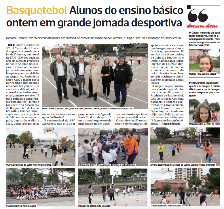 No dia 30 de Outubro, realizou-se em Coimbra o OPEN DAY BASKETBALL. Organizado pela Associação de Basquetebol de Coimbra, em conjunto com todas as juntas de freguesia do Concelho, 6 agrupamentos de escolas e entidades como o ISCAC, a Cáritas, a APCC, a APPACDM, permitiu a participação de 1700 jovens entre os 8 e os 10 anos.