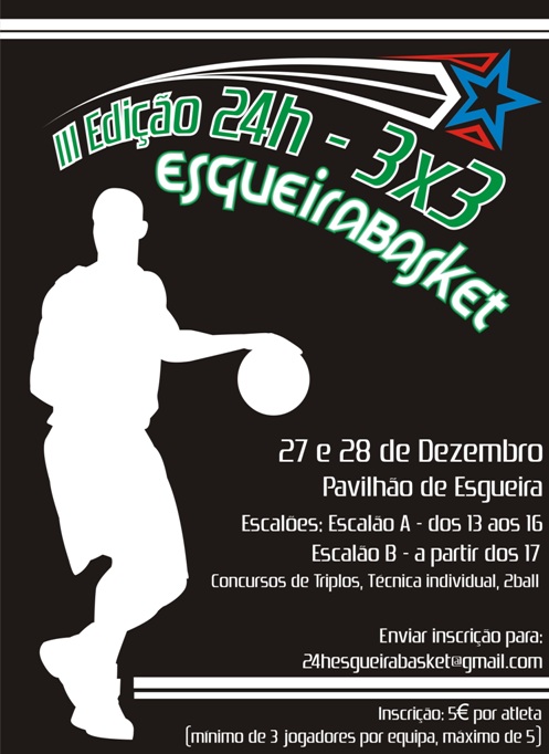 Pelo terceiro ano consecutivo o Clube do Povo de Esgueira vai realizar o Torneio 24horas 3×3. Como já vem sendo tradição, o Torneio vai realizar-se na época natalícia, mais precisamente nos dias 27 e 28 de Dezembro e começará pelas 15 horas do dia 27. Além dos jogos de 3×3, também haverá os já habituais concursos de 3 pontos, técnica individual e 2ball em que todos se podem inscrever, sem qualquer custo adicional. Cada equipa poderá trazer no máximo 5 atletas, sendo que o mínimo é, obviamente, 3 atletas por equipa, sendo que o custo de inscrição é de 5€ por atleta. No acto de inscrição indiquem, por favor, o nome da equipa, nome dos atletas, data de nascimento e nº BI, bem como os concursos em que queiram participar. Para proceder às inscrições e para esclarecer qualquer tipo de dúvida, entrem em contacto através do seguinte mail: 24hesgueirabasket@gmail.com