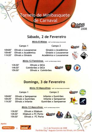 Depois do êxito do Torneio Carnaval do ano passado, promovido pelo Olivais Coimbra, clube com "Certificado de Qualidade de Escola Portuguesa de Minibasquete em 2006/2007", com o intuito de divulgar a modalidade, vamos levar a efeito, nos próximos dias 2 e 3 de Fevereiro 2008, no Pavilhão Eng.º Augusto Correia em Coimbra, mais um Torneio de Carnaval de Minibásquete para despertar a magia e o encanto nos atletas de Minis