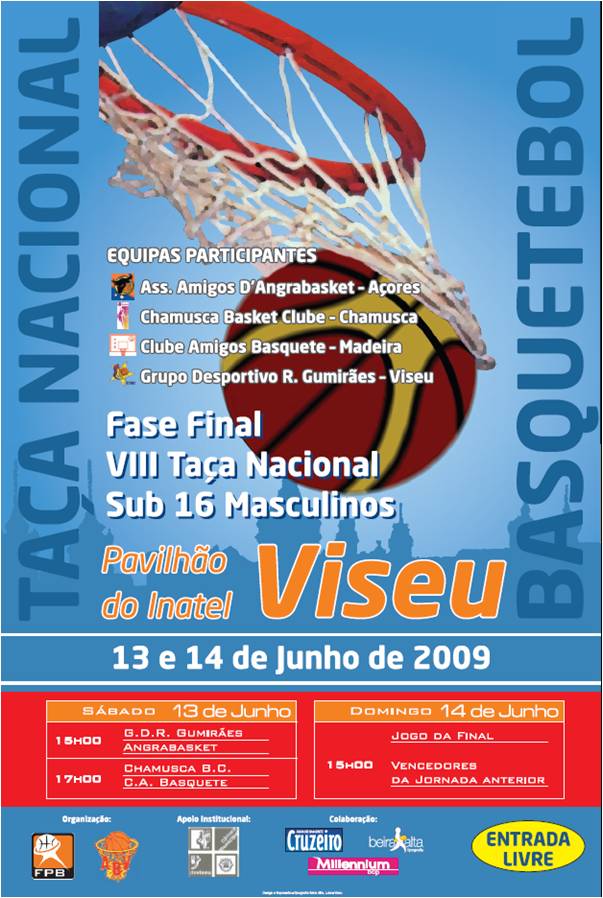 Com o apoio institucional da Câmara Municipal de Viseu e em mais uma organização conjunta da Federação Portuguesa de Basquetebol e da Associação de Basquetebol de Viseu, vai disputar-se, nos dias 13 e 14 de Junho, no pavilhão do Inatel, a fase final da VIII Taça Nacional de sub 16 masculinos.Com a participação das equipas representantes dos Açores – assoc. amigos d´angrabasket- , da zona sul do país- chamusca basket clube-, da Madeira- clube amigos do basquete- e da zona centro norte- grupo desportivo e recreativo de gumirães, Viseu.Os jogos terão inicio às 15h00 e 17h00, do dia 13, jogando-se a final, às 15h00, do dia 14 de Junho.