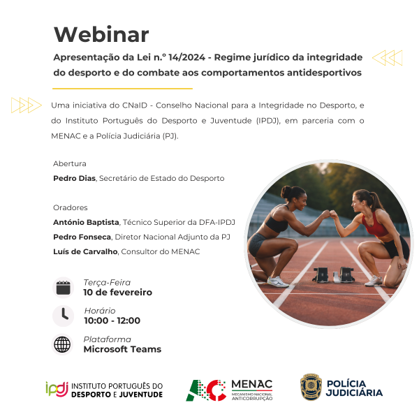 O evento decorre a 10 de fevereiro de 2026, das 10h às 12h, via Microsoft Teams. Serão realizadas 3 comunicações sobre temas ligados à lei, às potencialidades de detecção de crime e à ética/desporto.